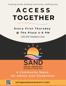 A monthly, in-person meetup for adults with disabilities, hosted by SAND. Open to adults with disabilities, their family/friends/support staff, and allies. ADA-accessible space.