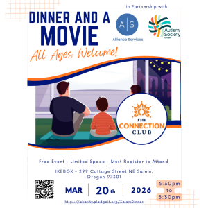 The Connections Club hosts a Dinner and a Movie night in Salem, in partnership with Alliance Services and Autism Society Oregon.