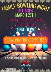 Advocate Access NW presents their monthly Family Bowling Night on March 27th from 4-6pm. Bowling – Friends – Prizes.