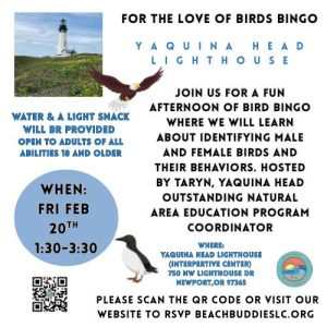 Join Beach Buddies for a fun afternoon of bird bingo where you will learn about identifying male and female birds and their behaviors. Hosted by Taryn, Yaquina Head Outstanding Natural Area Education Program Coordinator.