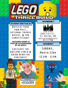 Advocate Access NW presents their monthly Lego Thrill Build event on Sunday, March 22 from 12-3pm.