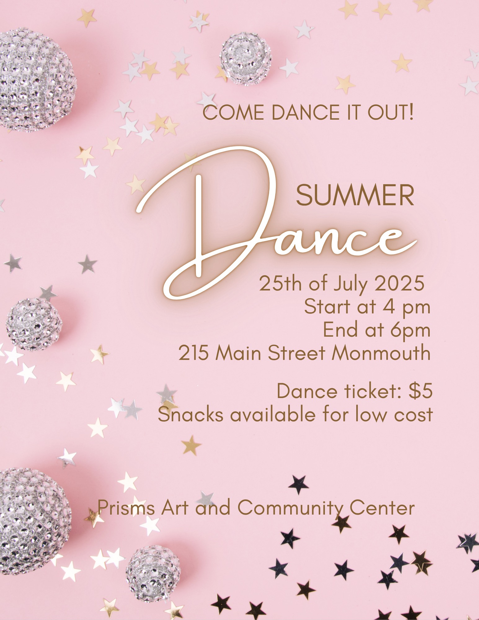 Prisms Art and Community Center is hosting a July Summer Dance! Dance tickets are $5 and all are welcome!