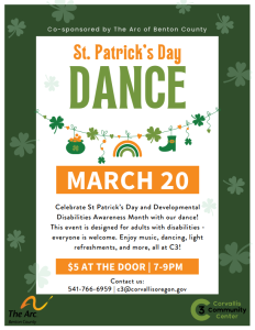Join the Corvallis Community Center and The Arc of Benton County in celebrating St. Patrick’s Day and Developmental Disabilities Awareness Month at this dance. The event is designed for adults with disabilities, but all are welcome. $5 admission at the door.