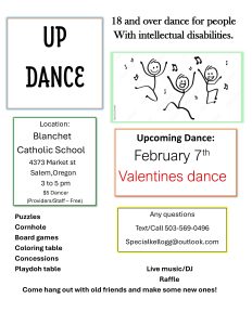 UP Dance for people with intellectual disabilities 18 and over. Live music/DJ and dancing, a raffle, as well as other activities: puzzles, cornhole, board games, coloring table, playdoh table, concessions. Come hang out with old friends and make some new ones!